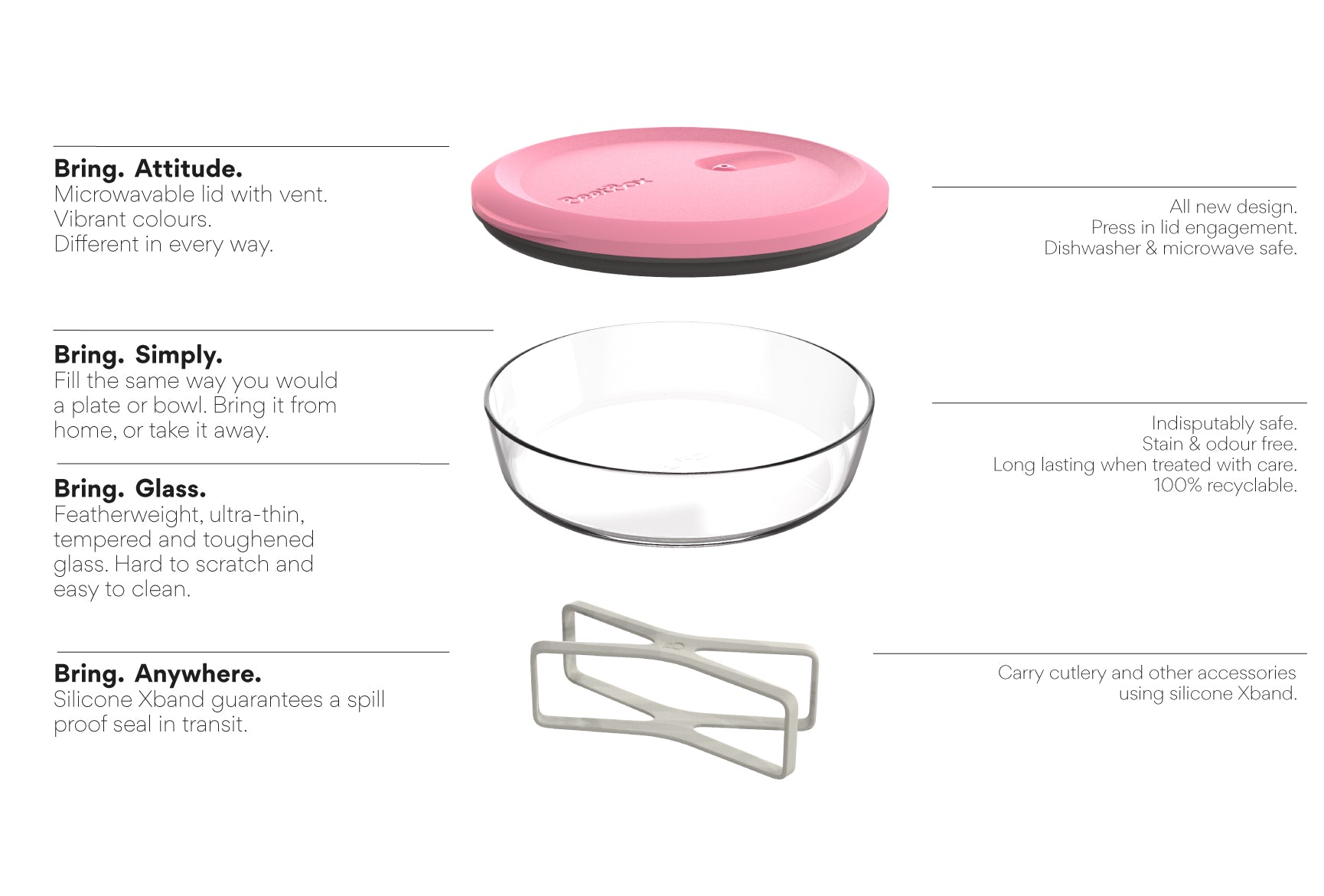 Our all new "GO" 850ml Glass Lunch Bowl product. BLACK colourway, featuring black moulded lid with pressure release valve and black silicone Xband.