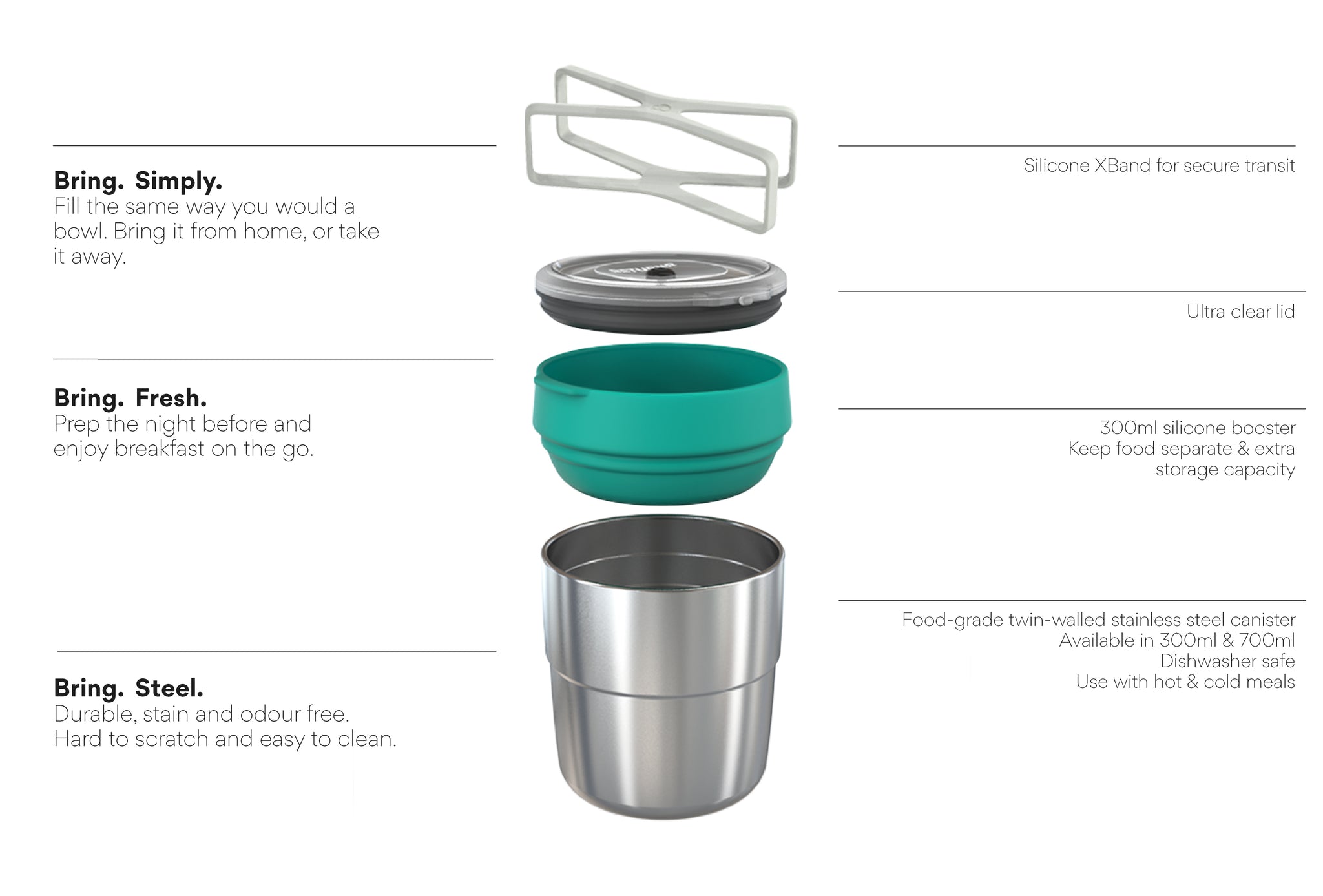 The 700ml + 300ml double compartment Brekkie Bowl. GREEN colourway, featuring insulated twin wall stainless steel 700ml bowl with 300ml silicone booster insert. Ultra clear Tritan lid with air vent and silicone seal. Silicone Xband to keep extra secure in transit. Keep foods separate during transit and storage, mix together or enjoy separately.
