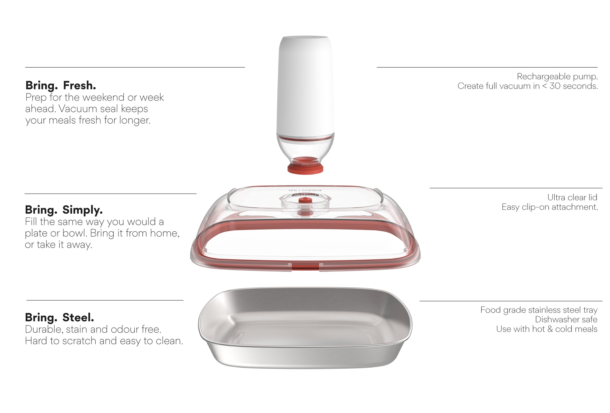 Featuring durable stainless steel tray, ultra clear lid & rechargeable vacuum pump.